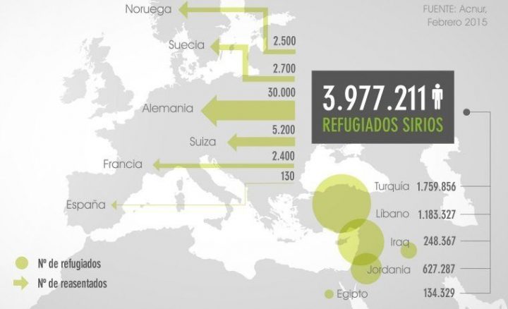 Sólo el conflicto sirio habría provocado -hasta 2014- cerca de cuatro millones de desplazados fuera del país. Y como muestra este gráfico de la web Refugiados más que cifras, la inmensa mayoría de ellos están siendo acogidos por sus países vecinos.