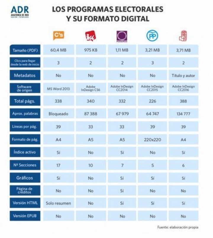 Desde Anatomía de la edición queremos sumarnos al debate desde una perspectiva profesional. Tomando como materia de análisis los programas electorales de los cinco grandes partidos (Ciudadanos, Izquierda Unida, Podemos, el Partido Popular y el Partido Socialista Obrero Español), hemos querido averiguar qué tipos de documentos han publicado cada uno de ellos. Hemos descargado, revisado y comparado los distintos archivos PDF desde un punto de vista técnico editorial, teniendo en cuenta la accesibilidad, la lectura y la navegación, la organización de la información y el software de origen y los formatos. Este ha sido el resultado de la evaluación: