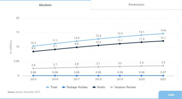 Es más, según los datos que encontramos en Statista.com vemos como los usuarios online interesados en paquetes de vacaciones seguirán aumentando hasta el año 2021:
