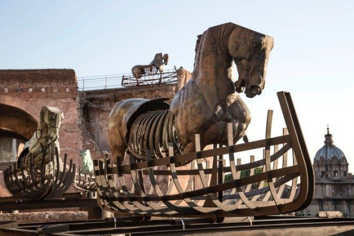 Desde el pasado septiembre los turistas que visitan Roma pueden contemplar la exposición escultórica Lapidarium, del artista mexicano Gustavo Aceves. 40 caballos, de entre 3 a 12 metros, "galopan" en los rincones más impresionantes de la ciudad eterna, el Coliseo, el Arco de Constantino o el Mercado Traiano.