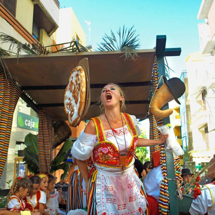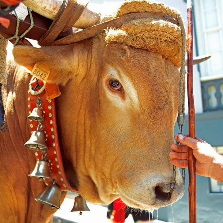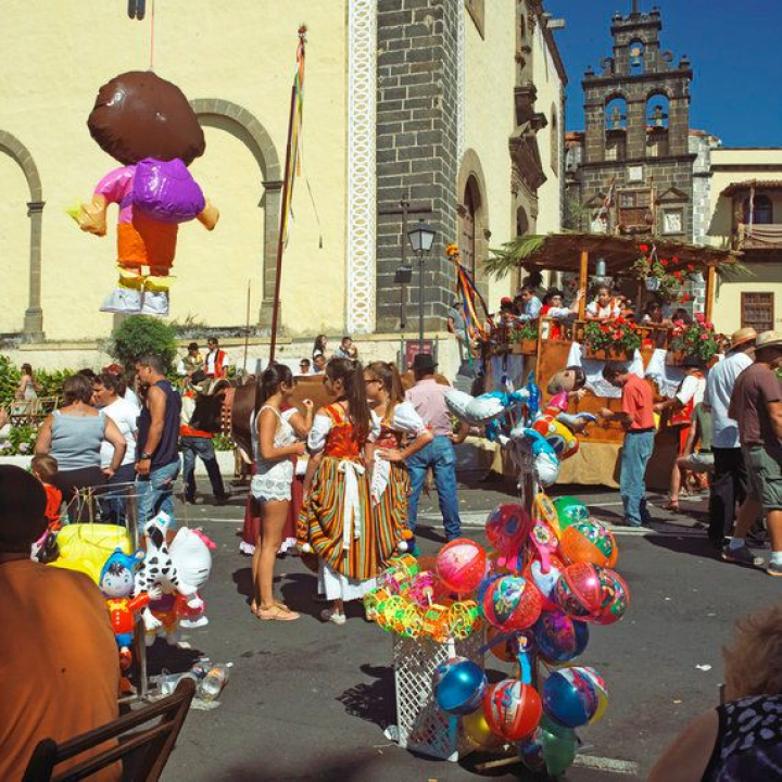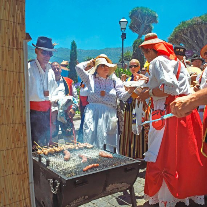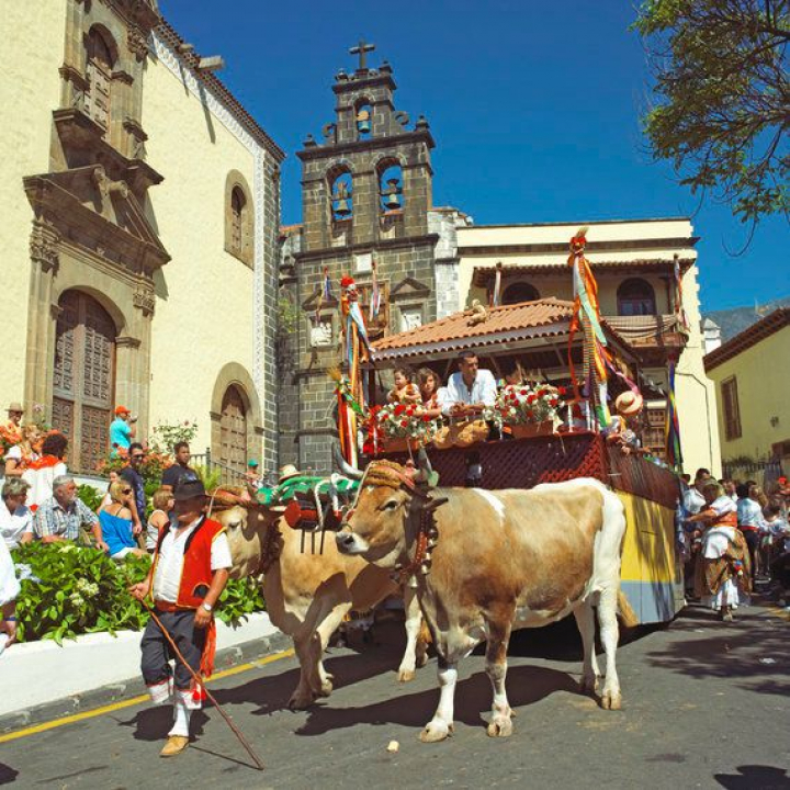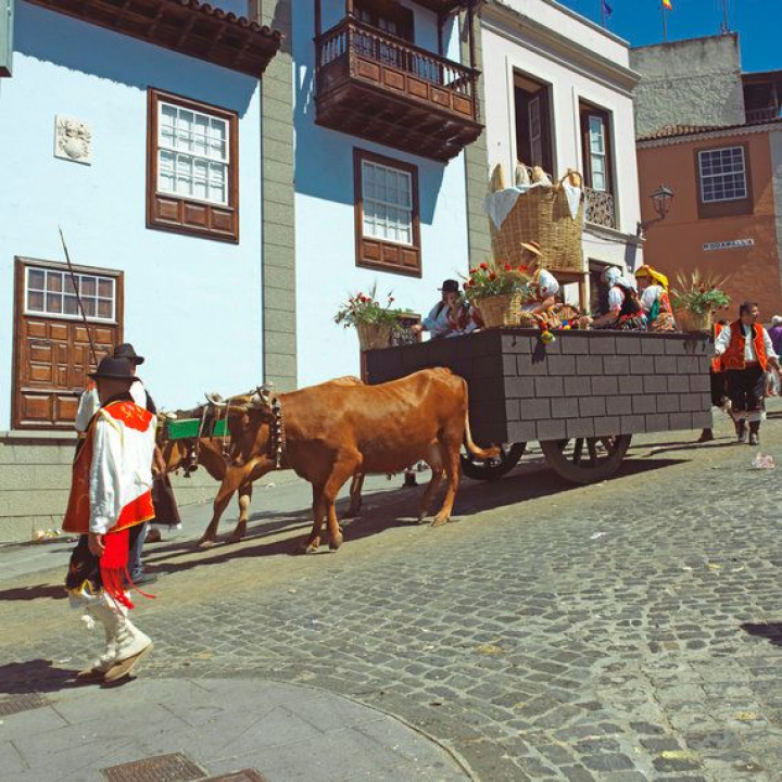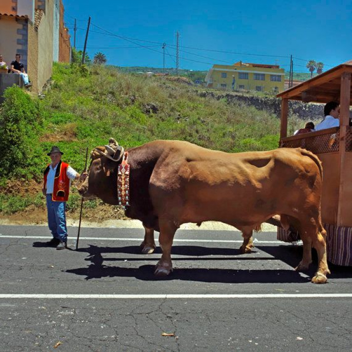 Uno de ellos es la marcha de más de mil bueyes canarios- algunos de más de 800 kilos de peso- arrastrando las tradicionales carretas de madera, cuyas ruedas parecen a punto de romperse por el peso en cualquier momento, llenas de gente de todas las edades, asando carne en la parte trasera y sirviendo vino a cuantos pasan a su lado.