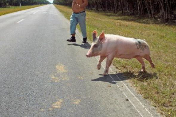 Viajaba por la carretera recta que termina en Bahía Cochinos y pasaba justo por una comunidad que se llama Pálpite, cuando un cerdo manchado escapó de un carrito de madera que llevaban unos hombres.