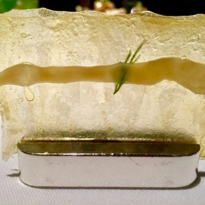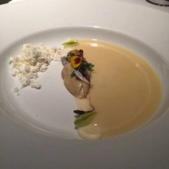 Solo como ostras (o casi) en Atrio. Parece que al cocinero tampoco le gustan y siempre las disfraza con algo. Sé que a los puristas les puede disgustar, pero tiene el valor de ensalzar el producto con aditamentos sorprendentes. La ostra se pasa levemente por la parrilla y se acompaña con caldo de vermú blanco. El aceite solidificado le presta su sabor, terrestre y untuoso, a la escurridiza ostra que comparte protagonismo con el caldo en un juego de sabores que se potencian.