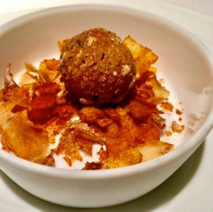 Con la patata revolcona con su piel crujiente explotan uno de los grandes logros de la cocina de Atrio, las recetas populares transformadas en alta cocina y a eso no es ajeno ni el lujoso relleno de foie y panceta ni la piel de la patata reconvertida en virutas crocantes.