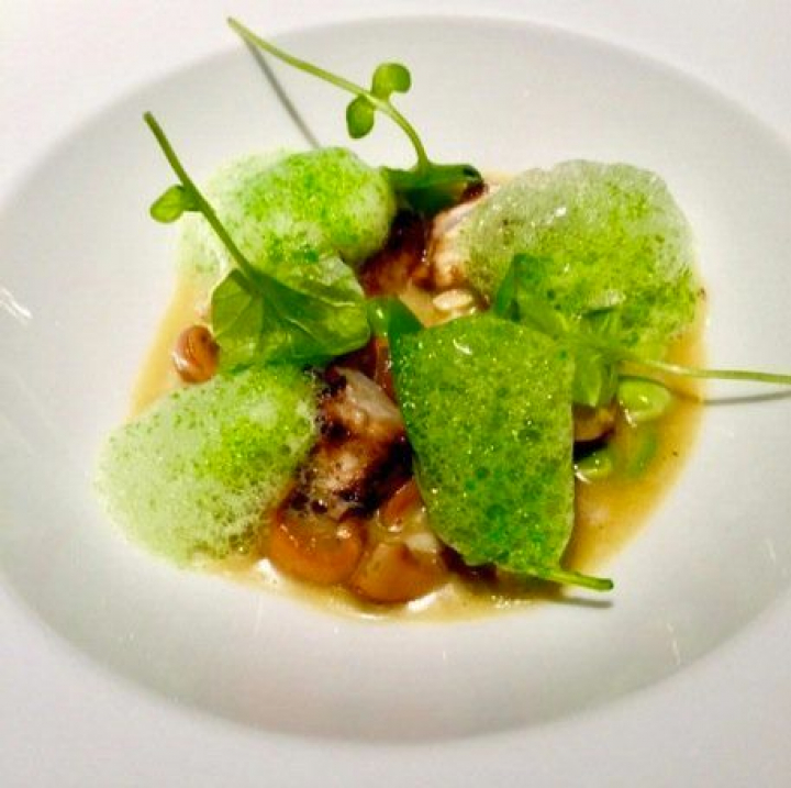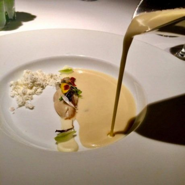 Los sabores de la seta son genuinamente atrianos y lo mismo sucede con el contundente plato que sirven a continuación: vieiras con estofado de níscalos y habas, para mí el culmen del menú porque contiene todas las esencias de esta cocina: sabor, tradición, contundencia, salsas poderosas, bellas composiciones y toques de pacífica modernidad representados aquí por un aire de romero que a la vez refresca y embellece.