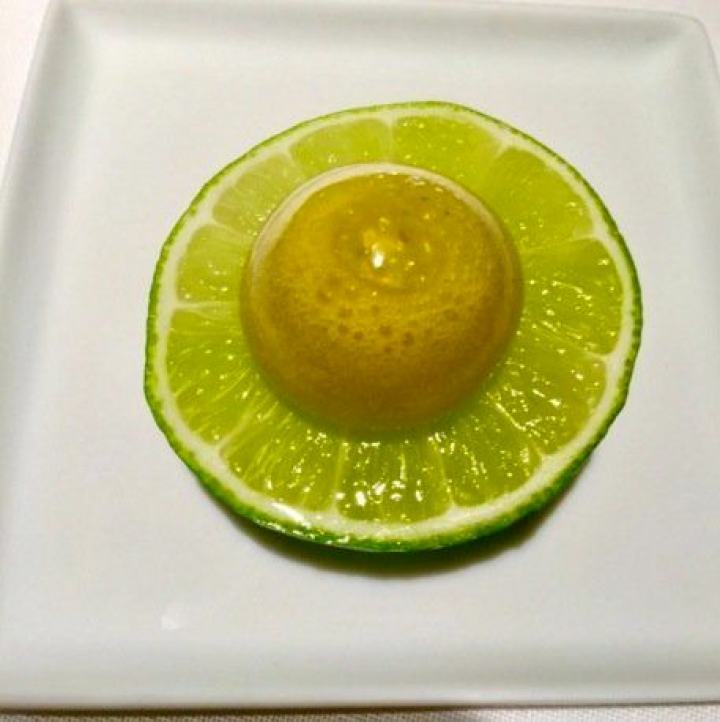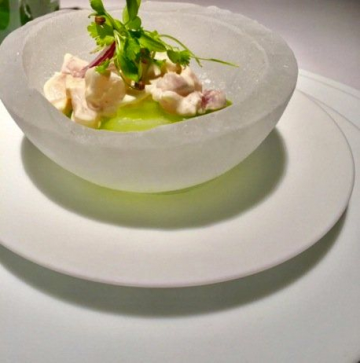 El ceviche sólido de mero con semiesfera de fruta de la pasión es una gran creación que se sirve en una semisfera de hielo que parece un cuenco. Para preparar el paladar, una esferificación de leche de tigre y lima servida sobre verdadera lima. La acidez, la frescura y la salinidad elevan este ceviche muy por encima de la receta original porque la descompone con talento. Uno de los grandes platos de esta nueva carta. Sencillo en apariencia pero lleno de complejidad.