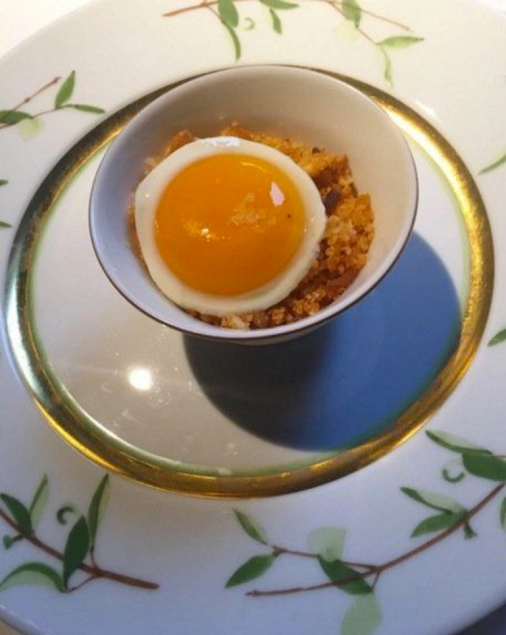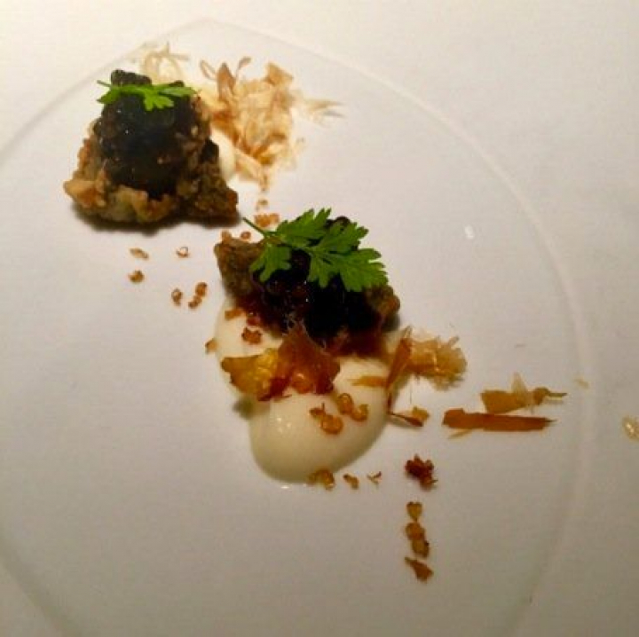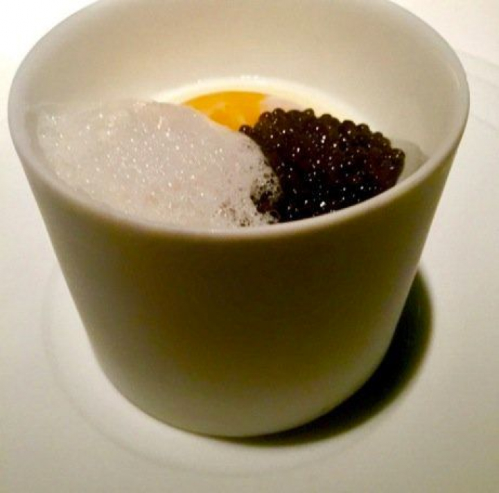 Sigue el caviar con huevo frito y apionabo al modo de Tomás Herranz (el recordado creador de El Cenador del Prado), otra elaboración sencilla y elegante que evoca una clásica mezcla para el caviar, la patata, aquí sustituida por la suavidad y el delicado sabor del apionabo.