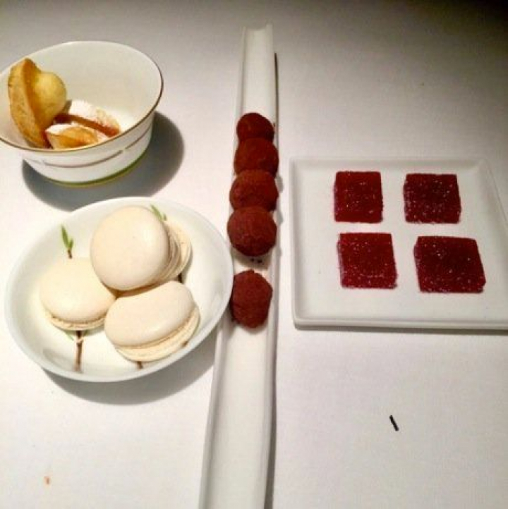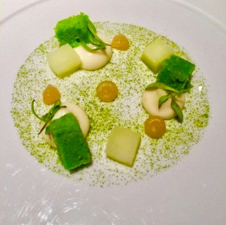 Después de tantos placeres casi era previsible que me decepcionara un poco el primer postre y es que la torta del Casar y pera con bizcocho de té matcha y aceite de oliva se ufana con una maravillosa estética pero decae por el contraste del queso y el té, sobre todo por la excesiva fortaleza de un queso fuera de temporada.