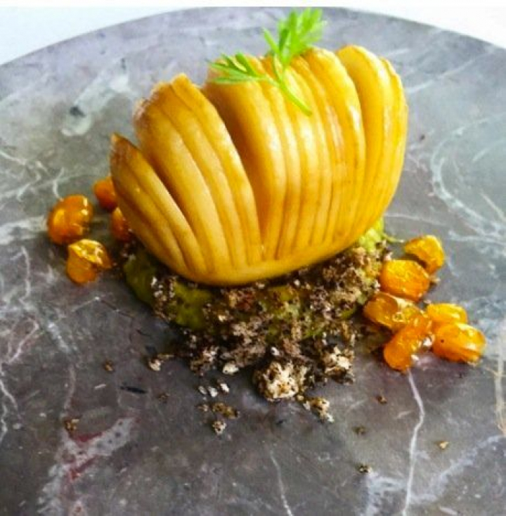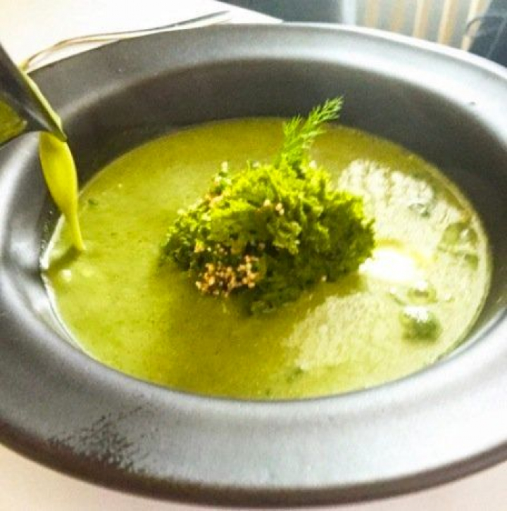 Es excelente sin embargo la sopa: papa y quintonil, huazontle (dos buenas y populares hierbas mexicanas) y amaranto. Todos los verdes empleados son precisamente de la familia del amaranto, aunque para darle un toque intenso y alguna alegría se añade también ajo encurtido. Las verduras tienen diferentes texturas y el resultado es variado y enjundioso.