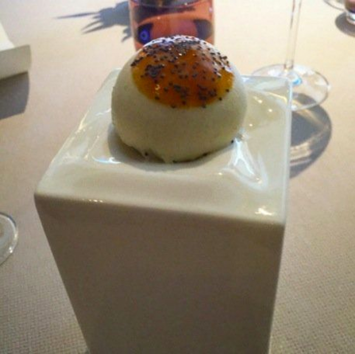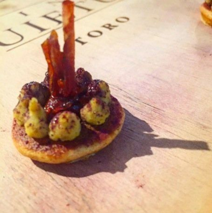 o a un llamado bocado aireado de polifenol con queso azul macerado en vino. La tartaleta, llena de sabores fuertes, es mucho más sensata que el nombre y mezcla texturas y sabores admirablemente, si bien la presencia de cualquier componente del vino está presente como en todo el resto de los aperitivos.