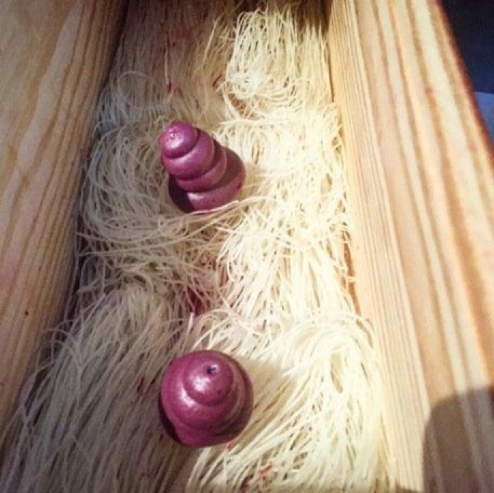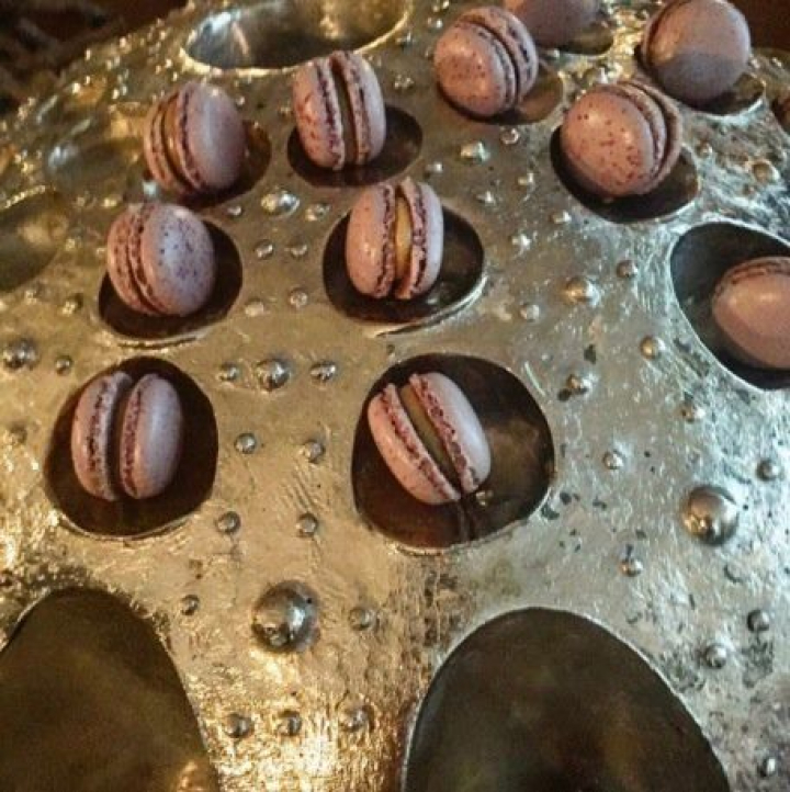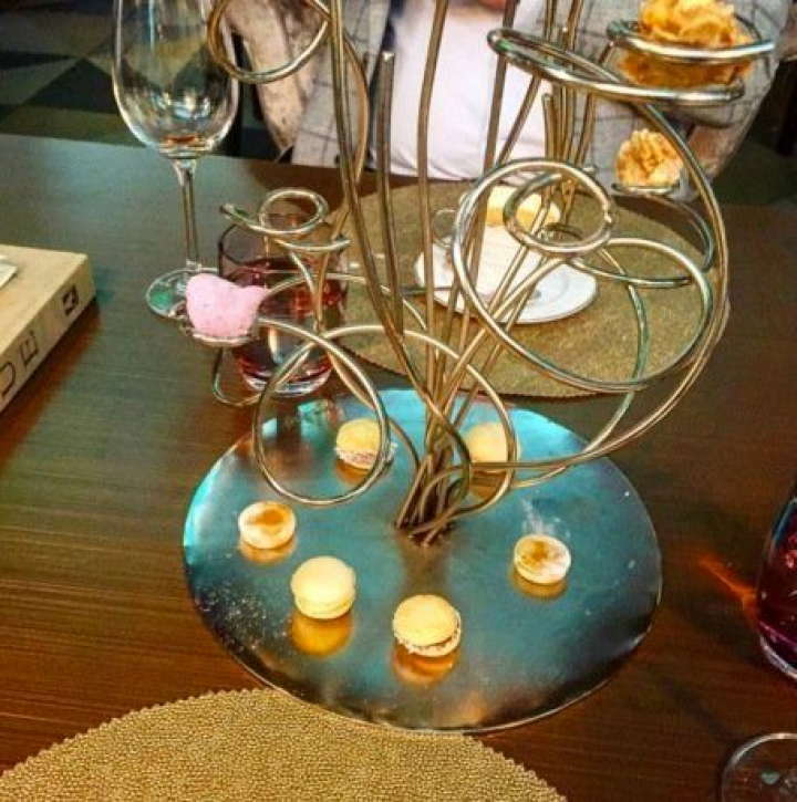 Antes, hemos tomado de una extraña estructura plateada, el único bocado que no se sirve en caja de vino, el macarron de Merlot con torta del Casar.