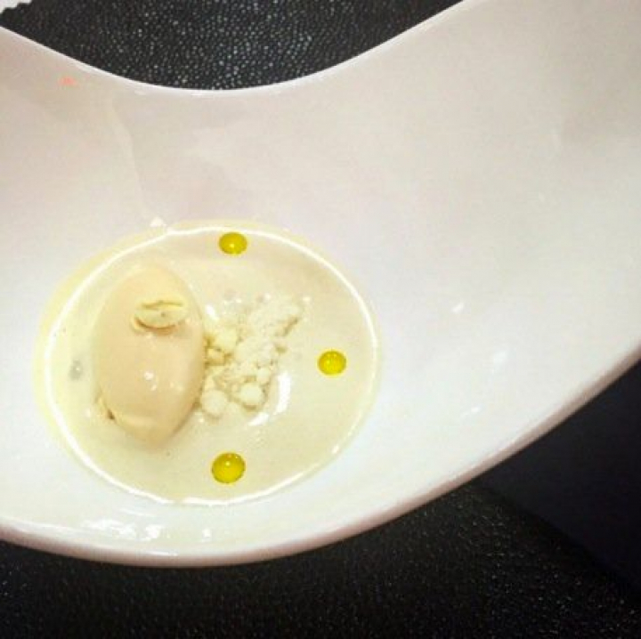 Él nos ofrece el primer gran bocado del almuerzo, una enorme creación a partir de la sencillez de un ajoblanco, sencillo, pero también uno de los mayores platos de la cocina española. La particularidad de este es que es de piñones y se llama, piñón hidrolizado con helado salado y extracto de su aceite. Quiere decir que de un simple piñón extraen agua, aceite, leche y dos tipos de pasta y con todo eso, pero con nada más, se elabora este prodigioso plato.