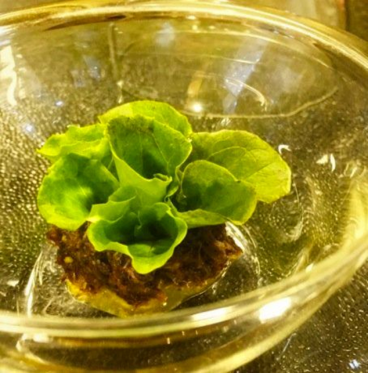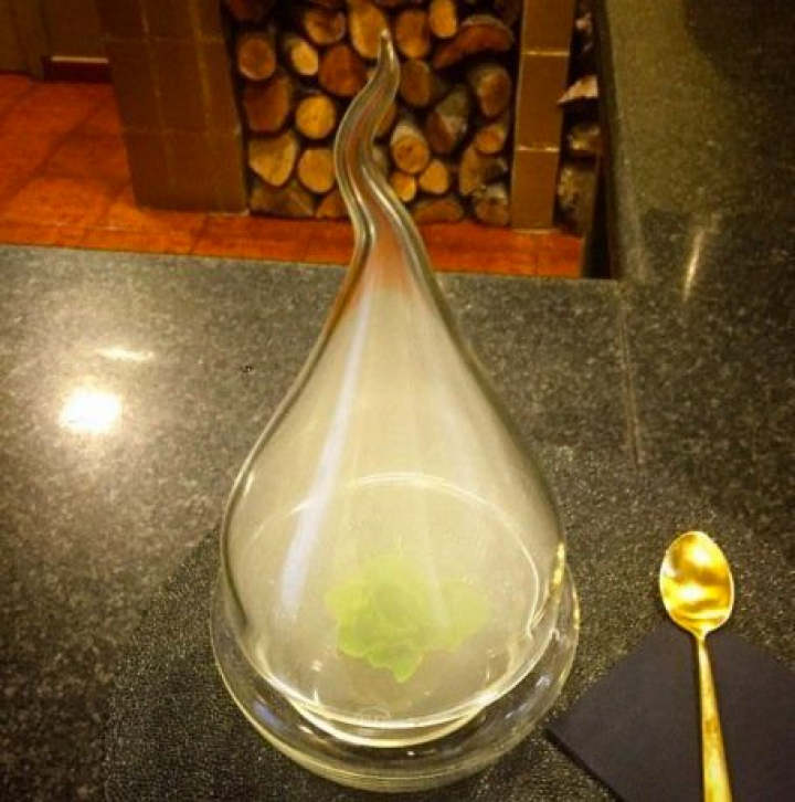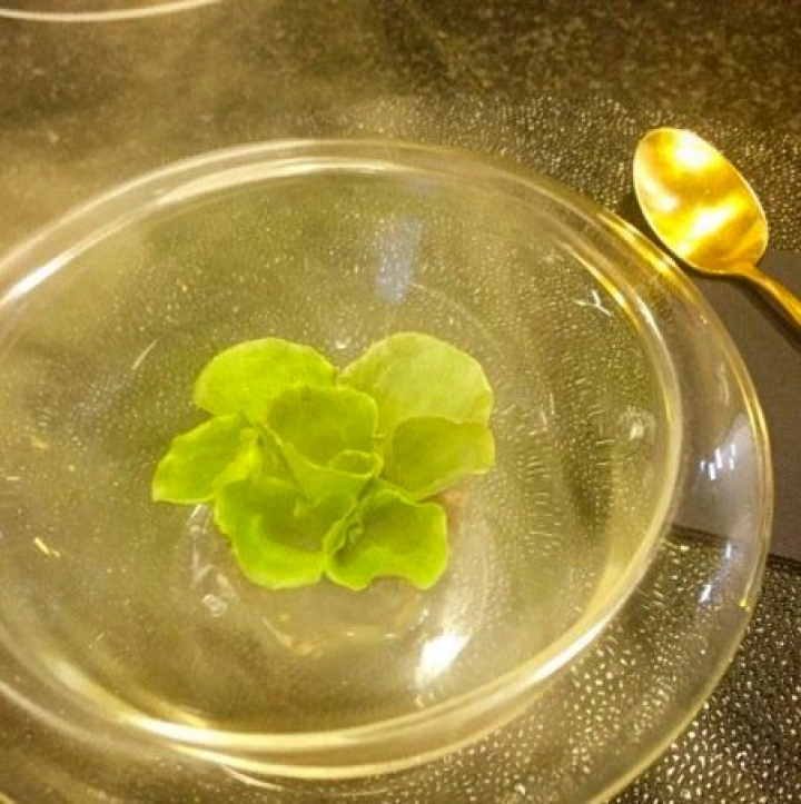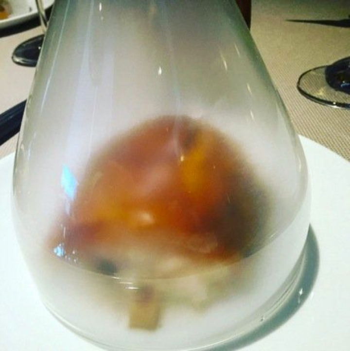 En la zona de los hornos, para los que usan tres tipos de leña, una campana de cristal esconde, entre humos aromáticos, la lechuga Batavia ahumada y estofado de ternera con polifenoles de vino, un bello huerto que mezcla el frescor de la lechuga tierna con la fuerza de la carne.