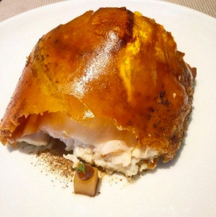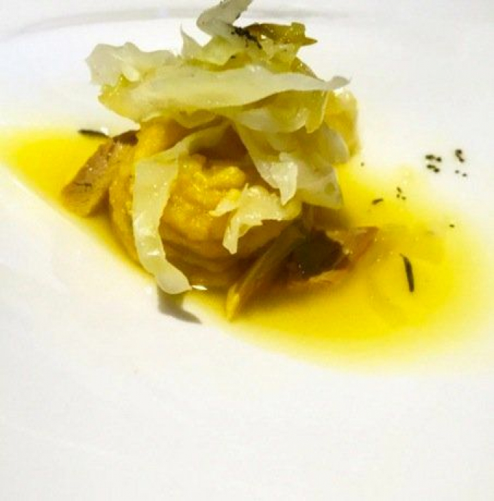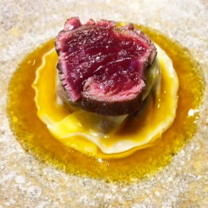 El ravioli meloso de toro bravo y tendones con higos y jugo de cochinita picante es un plato recio como los que se hacían en la meseta en tiempos de penuria y calores de secarral. En esta versión sofisticada pero fiel, se aprecia toda la fuerza del toro combinada con la suavidad de un ravioli lleno de sabor y aromas que se deshace en la boca.
