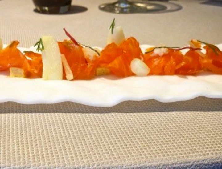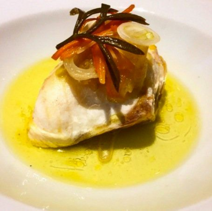 Nada que ver con el soberbio escabeche de esturión nazarí vinagre de uva, miso, enebro, mostaza y algas, una recreación simple pero que tiene toda la complejidad de lo clásico, enriquecida por la fusión que provoca toda una explosión de sabores.