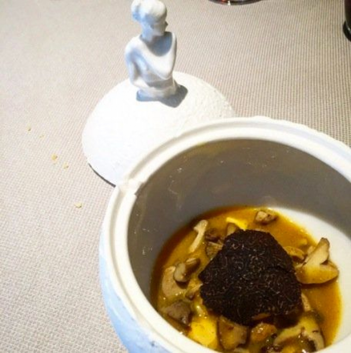 El paso al comedor es duro porque, tras tantos placeres, hay que enfrentarse a su penumbrosa fealdad. Menos mal que pronto resurgen los manjares sandovalianos: un delicioso pan al vapor con guiso de ternera y mostaza picante (otra vez el gran juego de sutileza y potencia) acompañado de un intenso consomé de carne y setas al Armagnac.