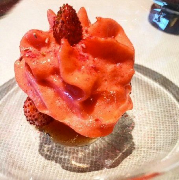 El helado de flor de hibisco con esponja de ginebra y helado de frutos rojos es el golpe de frescor que el paladar pedía tras tantas sensaciones fuertes, un descanso para el gusto y la vista porque su bello color y ese retorcimiento salomónico son lo más fuerte de lo suave, lo más intenso de lo sutil porque, no lo olvidemos, esta no es cocina para paladares timoratos.