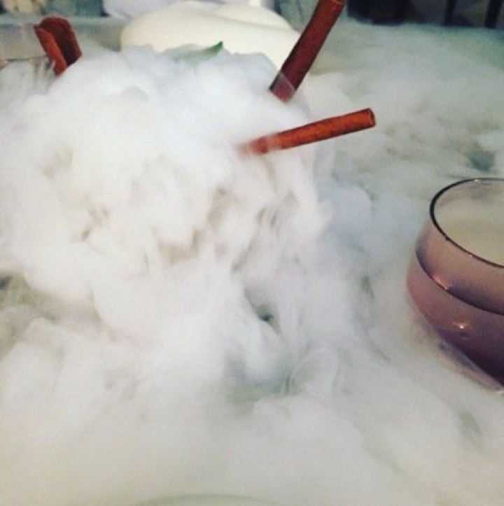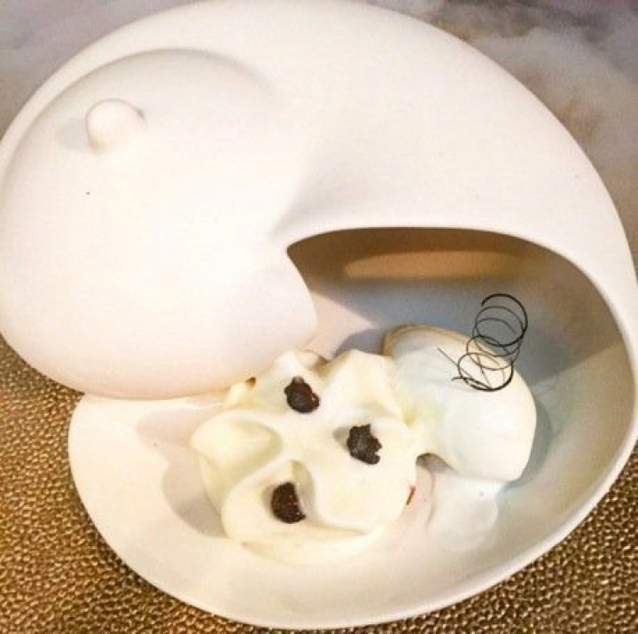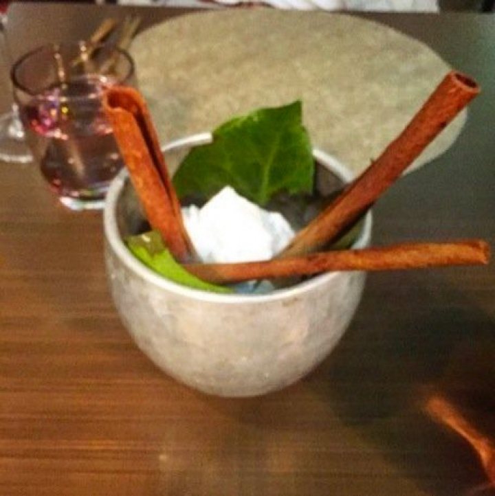 Allí se vuelve a la belleza del blanco por el que se empezó (el ajoblanco y el pan al vapor) y que nos siguió hasta el final en muchos de los recipientes o en las inmaculadas carnes del cochinillo. Todo es blancor en el delicioso e intenso yogur ácido de oveja con arándanos y espuma de trebejo ahumada que se sirve entre humos que sacan fulgores aromáticos de palos de canela en una presentación efectista y espectacular.