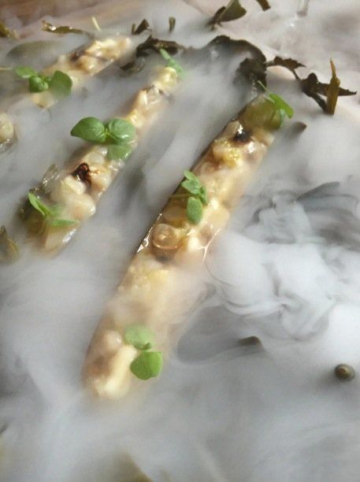 Después de Tailandia y México espera otro salto, esta vez a España. La morcilla de Beasain con puerro joven y ceniza parece una alubia blanca, porque Diego Guerrero es el rey del trampantojo, pero en la boca es morcilla pura.