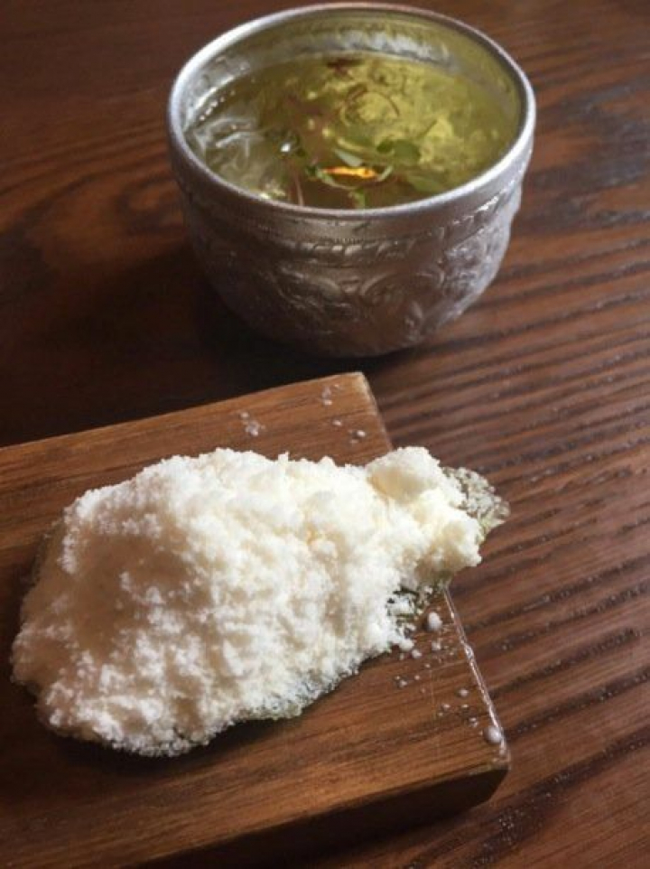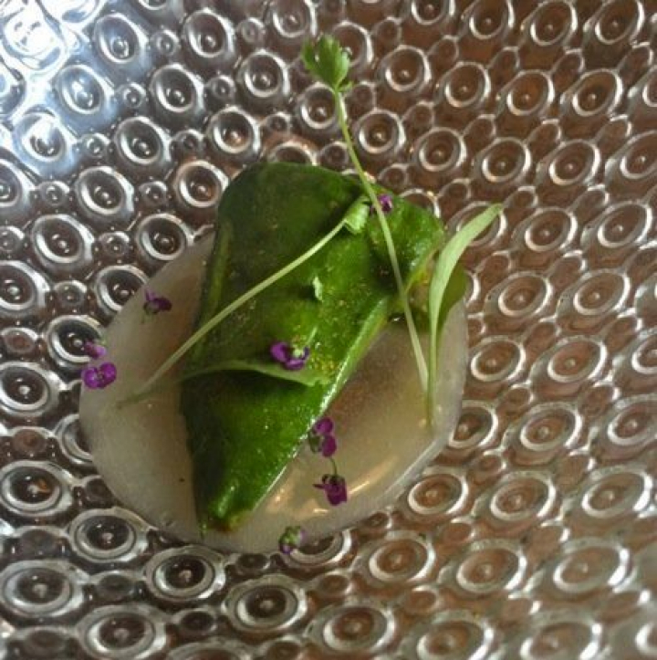 Los mariscos son Galicia viajera, pero la secuencia del pandan es puramente thai. El pandan, pandanus amaryllifolius, es una planta tropical ampliamente utilizada en la cocina del Sureste Asiático. Se da poco en la naturaleza pero se cultiva mucho. Primero llega en forma de pandan radish , que es la hoja de pandan con su propia gelatina y sobre ella una heladora y deliciosa nieve de radish que no es otra cosa que rábano. Para acompañar/enriquecer, y en recipiente de plata, té de pandan, una exótica infusión de hoja de pandan.