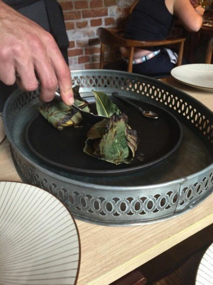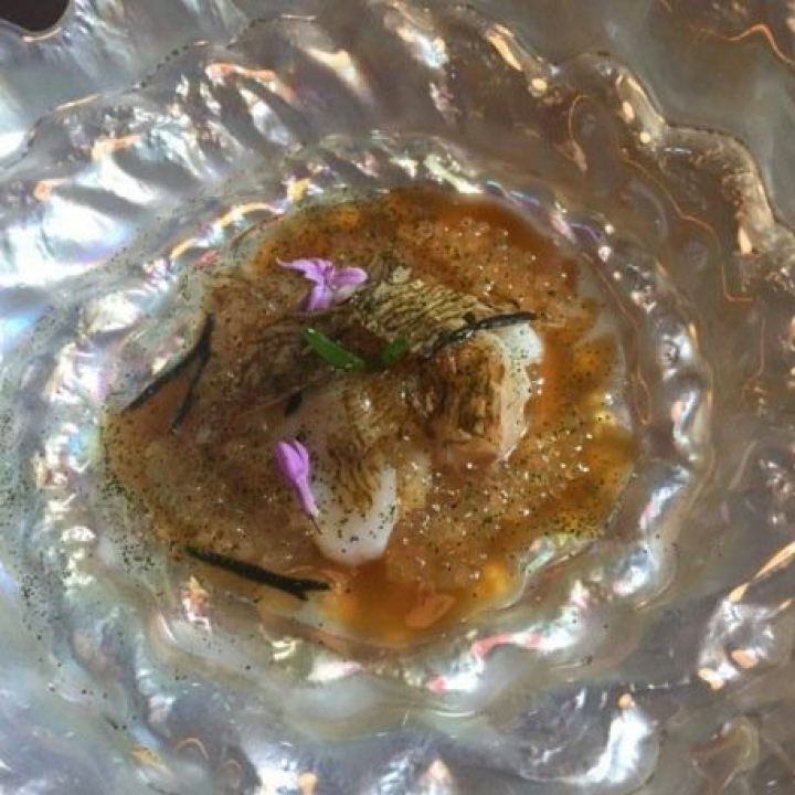 El bacalao en salmuera con jugo ibérico de kombu llega en un recipiente nacarado que parece el interior de la concha que apoya a Afrodita en el cuadro de Boticelli. El bacalao se cocina suavemente a la brasa y la salsa de alga kombu y las perlas de sagú lo engalanan convenientemente.