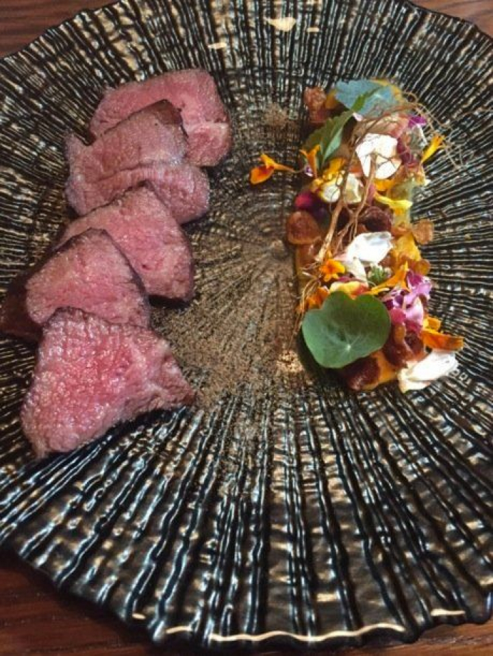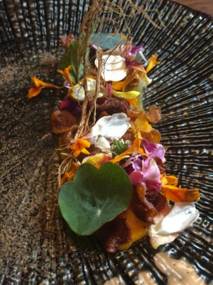 Diego Guerrero la rescata y se luce con ella exhibiendo muchas técnicas y toda la complejidad de su cocina en la que, tras una aparente sencillez, se esconden todos los retruécanos del barroquismo culinario. Primero presenta el plato plagado de flores y hierbas como una especie de jardín mágico del que emergiera el hechizante Puck, tal parece el escenario de El Sueño de una noche de Verano. El diminuto prado se llena de calabaza dulce, garbanzos de tamarindo, raíz de cilantro, tierra de setas y hojas de capuchina, nombres que parecen todos los de los ingredientes de la mágica poción que enloquece de amor y deseo a Titanía y Oberón. La carne se cocina -o se mima- de varias formas: primero con la lentitud del horno a baja temperatura, después a las altísimas de crepitantes brasas y, para acabar, ya en la mesa, en una caja que esconde ascuas de whisky y la llena de aromas a turba y musgo.