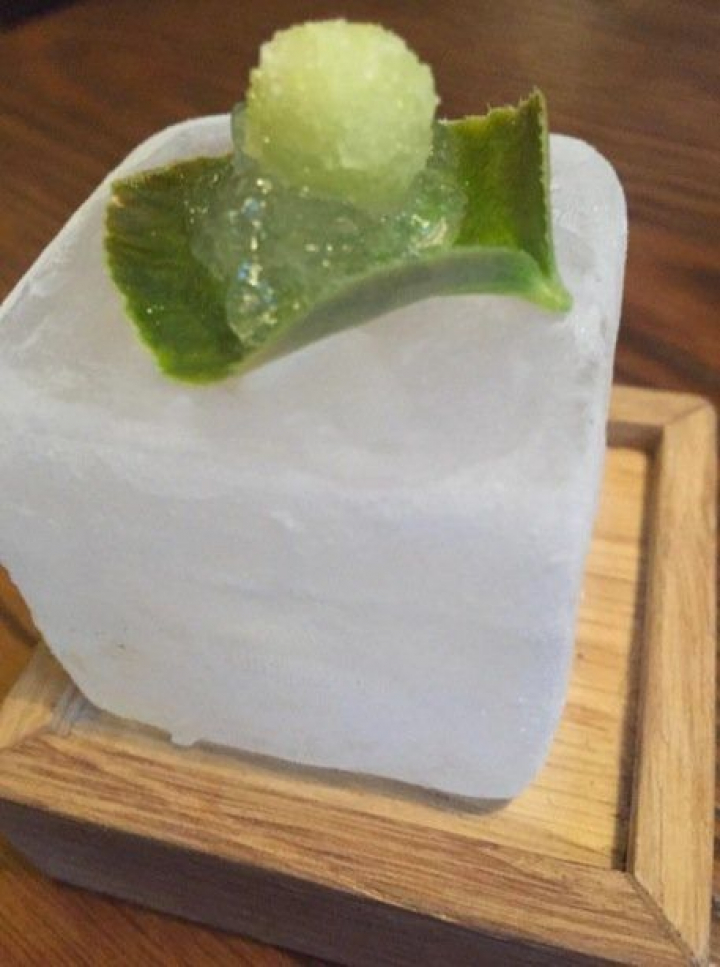 La begonia helada, margarita, manzana apio es el contrapunto refrescante que nos prepara para los postres. Colocada sobre un cubo de hielo bellamente rotulado con el anagrama de la casa, tiene toques frutales, florales y hasta suavemente alcohólicos porque la margarita no es la flor sino el cóctel del mismo nombre.