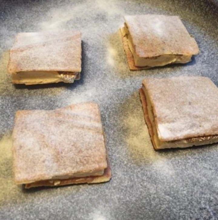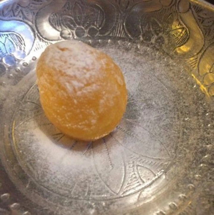 El albaricoque está nixtamalizado y para esta técnica de deshidratado se usa nada menos que cal viva. Relleno de suero de vaca parece un bocadito de nata pero mucho más frutal y saludable. Perfecto para el café... para cualquier cosa.