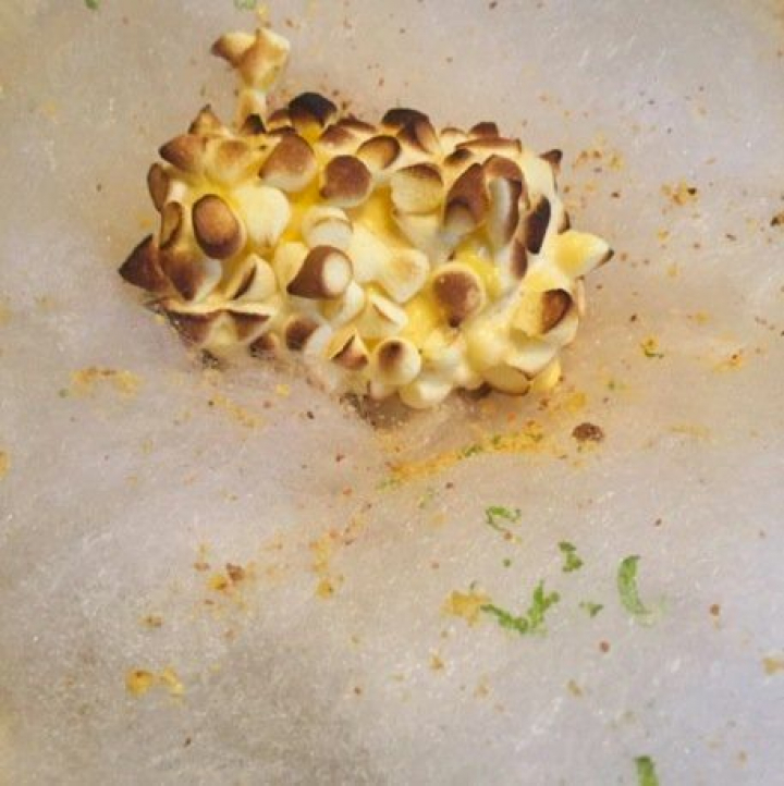 Tampoco el maíz es un postre al uso. La falsa mazorca con textura de merengue se coloca sobre un lecho de dulce infantil y de feria: algodón de azúcar. Este sirve como envoltorio para el maíz formando todo una especie de taco que también puerilmente se come con las manos.