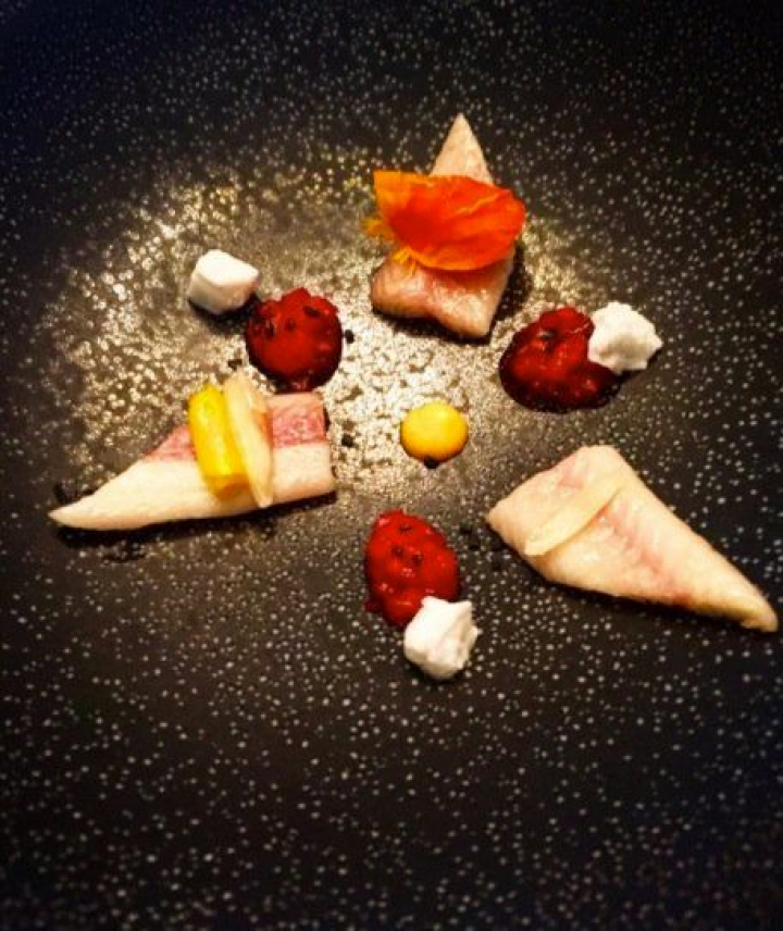 urta con migas de remolacha y escabeche de tomatillo, otro plato que mezcla texturas y crujientes y melosas con los sabores dulzones de las hortalizas más dulces.