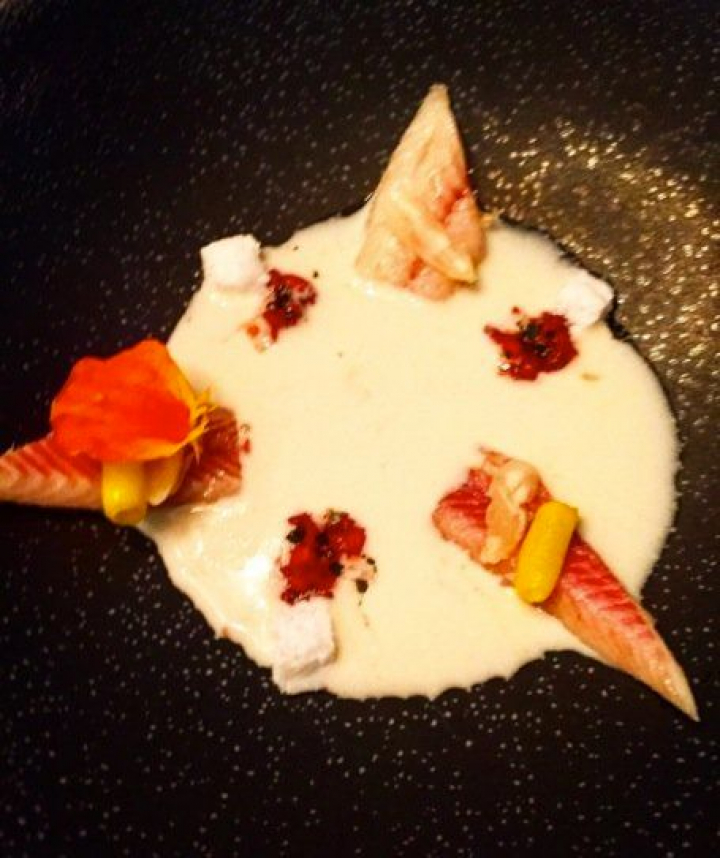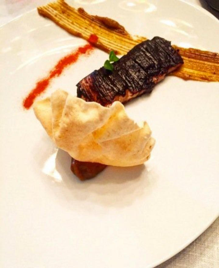 anguila ahumada con rocoto y cocoblanco a la que el tartar de fresas da un toque suave y dulzón que lo hace una muy agradable entrada. El rocoto, empleado con demasiada moderación, es un golpe picante que alegra el conjunto.