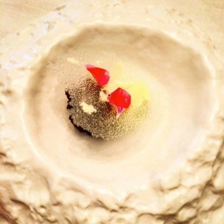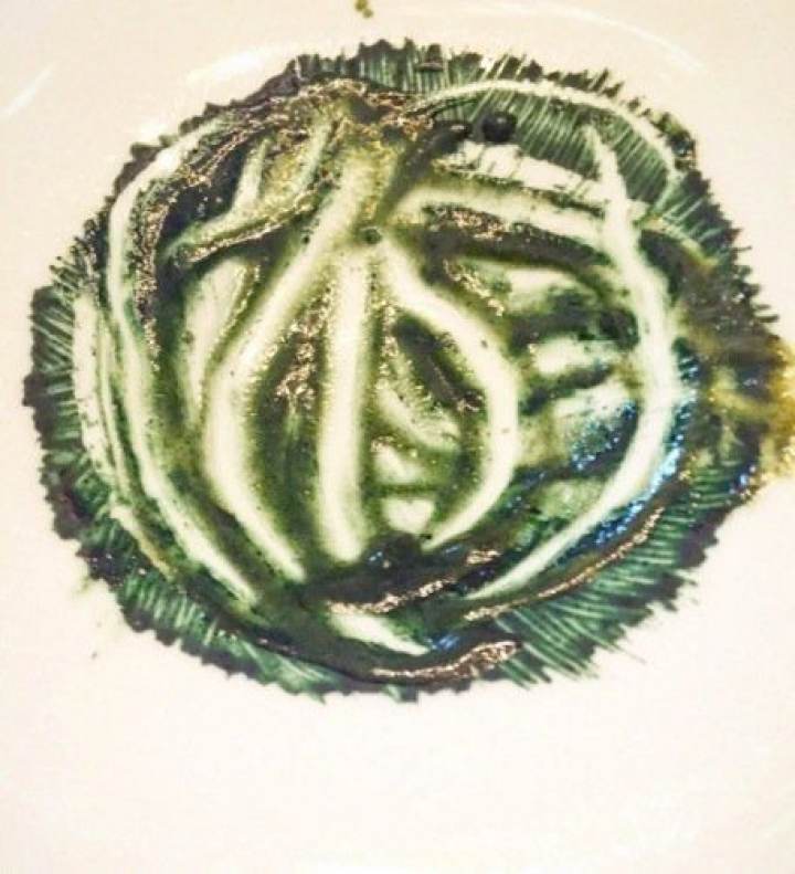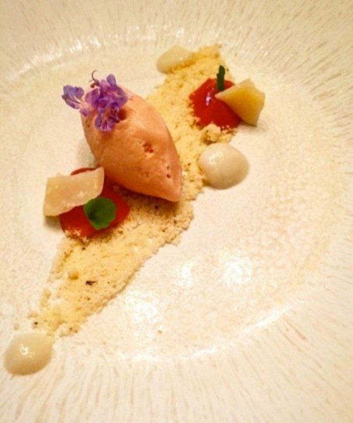 Seguimos con unas cigalas confitadas con ajomarino, sencillamente espectaculares, tanto en lo gustativo como en lo estético, porque el plato es pintado por la misma cocinera -aunque parece estampado de origen- con una pasta de algas y plancton que complementan y realzan los acompañamientos de emulsión de ajoverde y prado de plancton, ambos lo bastante sabrosos para vestir a la cigala, pero lo suficientemente sutiles para no restarle ni un ápice de su delicado sabor.