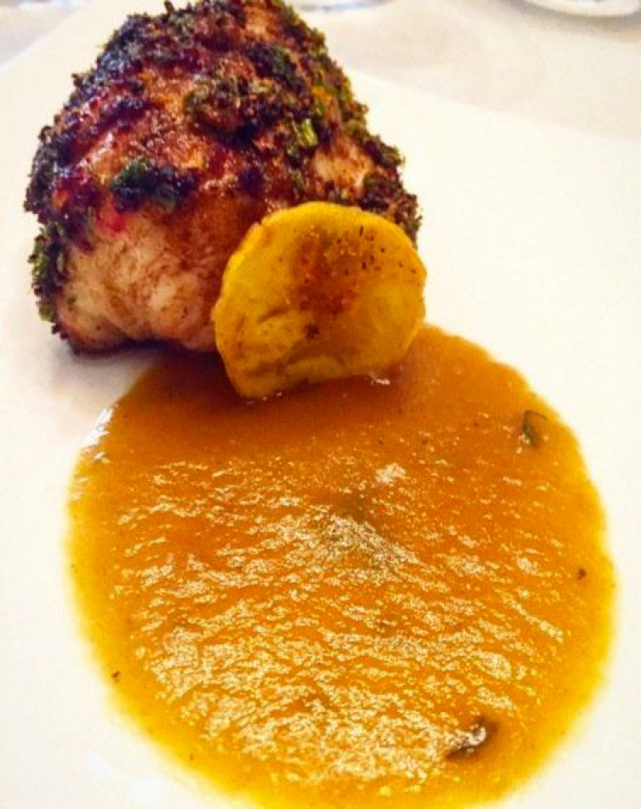 El sancocho de rape con plátano frito es una gran reinterpretación del guiso dominicano practicado de diversas maneras en otros muchos países y procedente de Canarias. El pescado queda increíblemente jugoso y la salsa, bien trabada y sabrosa, completa bien el conjunto. Si acaso peca algo de falta de fuerza, lo mismo que la excelente