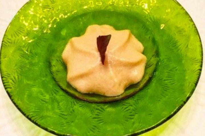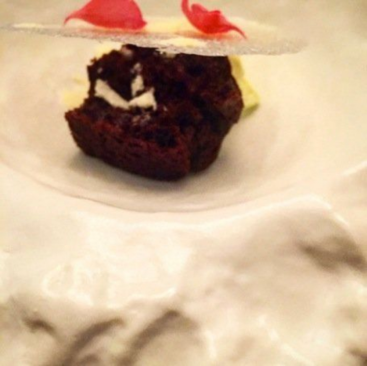 El monte invernal es un bellísimo plato compuesto por un correcto bizcocho de cacao, gel de menta, helado de aguacate y cristal de caramelo que se decora con un sutil toque floral. Un acertado colofón a una buena comida a la que aún se suma