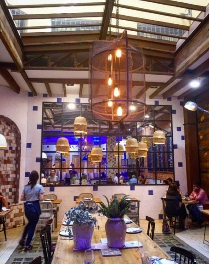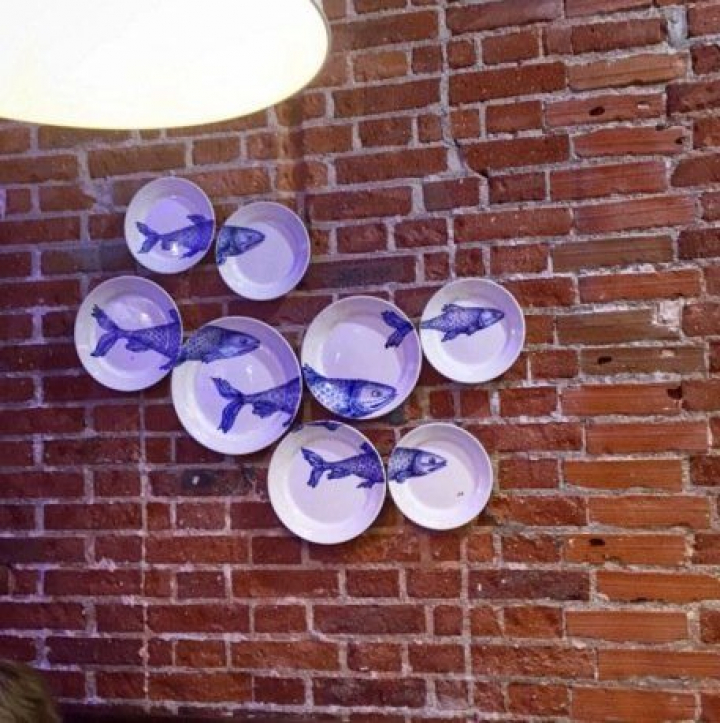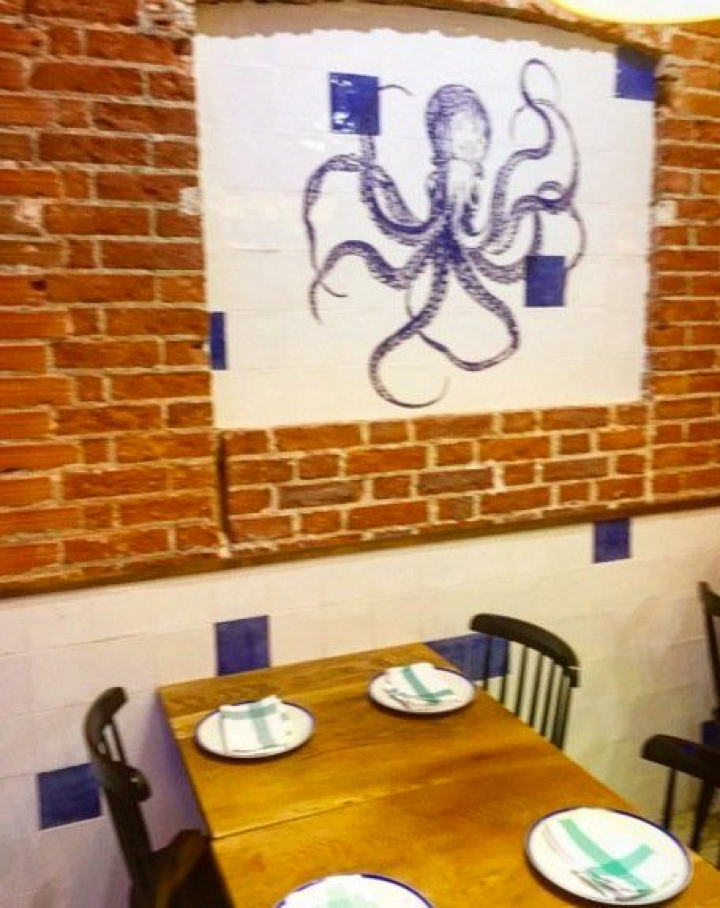 El ambiente es pretendidamente tabernario y bohemio chic (bohochic para cursis y estilistas, lo que viene a ser lo mismo), una elegancia muy del barrio de Salamanca, obtenida a base de ríos de luz, leves detalles marineros, desnudas paredes de ladrillo, enormes lámparas entre portuarias e industriales y espigadas vigas, ora falsamente oxidadas ora de viejas maderas. El toque más gallego está en el precioso azulejo del pulpo y en una composición de platos blanquiazules como los de Sargadelos.