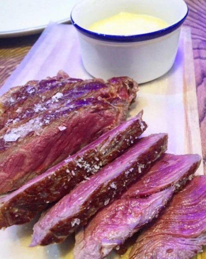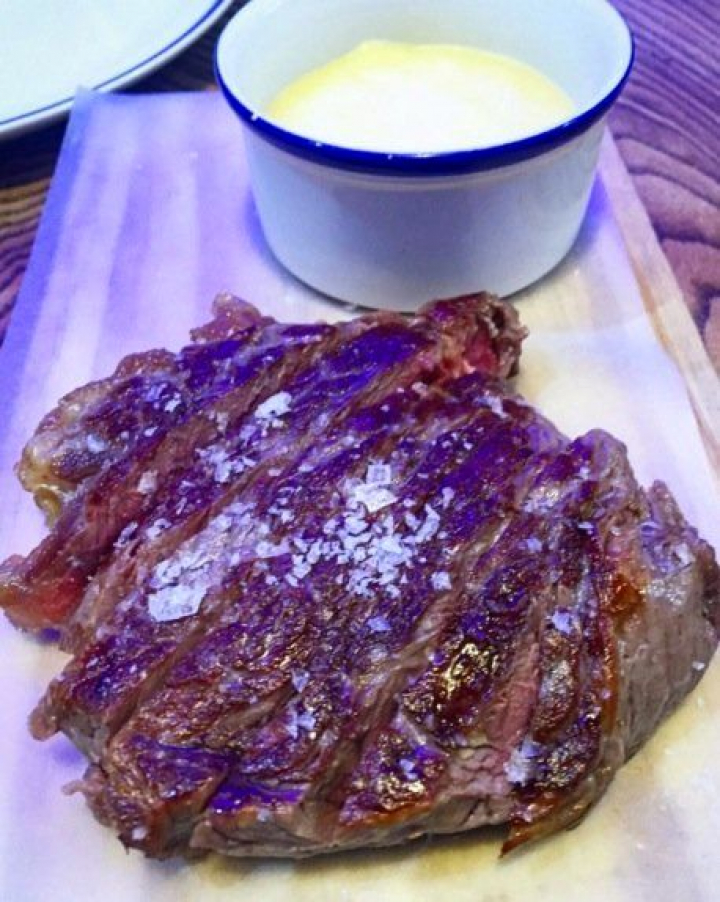 También muy bueno el entrecotte de vaca gallega aunque poner el pedazo tan cerrado no es muy atractivo. En la foto se lo he abierto para, gratuitamente, darles ideas. Una gran carne, un punto correcto y algún exceso de sal. Con lo fácil que es poner un potecito o un salero para que los más salados maten el sabor de la carne a golpe de sal...