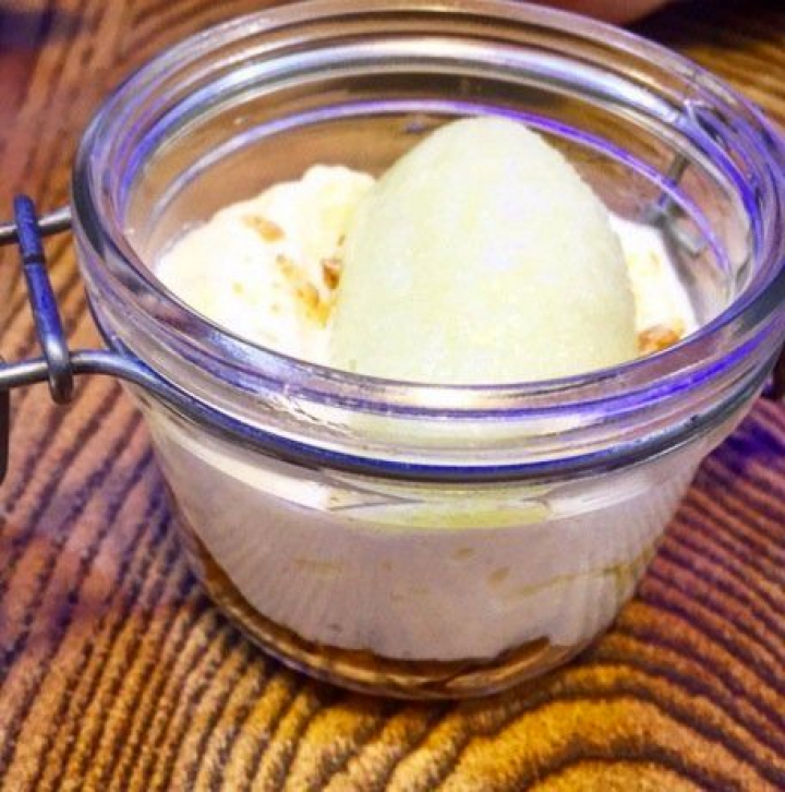 Esa torpe presentación me ha quitado un poco las ganas, por lo que nos hemos conformado con una muy buena tarta de manzana con almendras y canela que mezclaba en el potito un sorbete, crema, pedacitos de manzana y otros hojaldrados. La mezcla de todo muy buena.