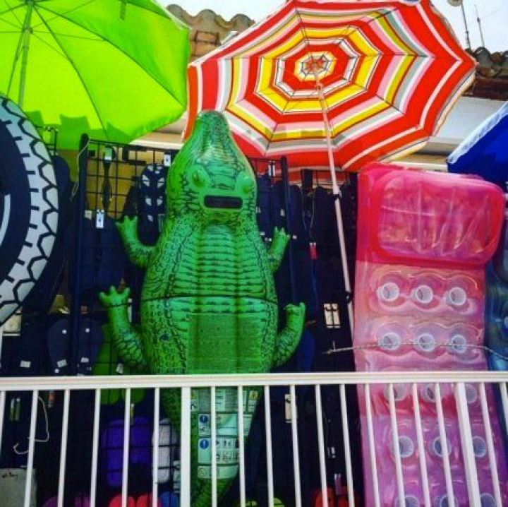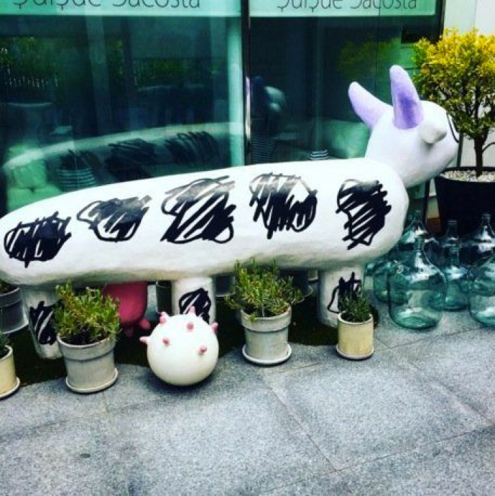 Nada más traspasar la puerta principal, en la que una palmera parece ser la rúbrica del nombre, entramos en un pequeño jardín abarrotado de sillones, banquetas y sombrillas blancas. Desde él, un inquietante animal nos observa.