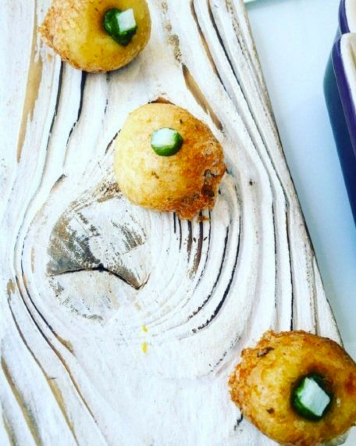 El buñuelo ligero de bacalao es un bocado sencillo pero que exhibe buena técnica, muy crujiente por fuera y con un relleno líquido que brinca hacia el paladar.