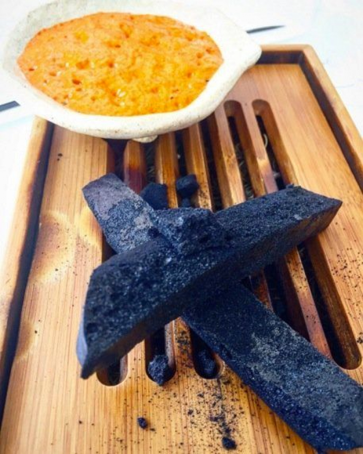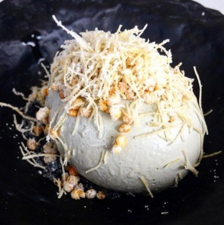 El carbón de pericana es un plato prodigioso, más por lo conceptual que por lo gustativo. Recrea la pericana, una salsa alicantina a base de pimiento y pescados que se moja en pan. Aquí tiene textura de crema espumosa y el pan se sustituye por un falso carbón, elaborado con el agua de asar los pimientos y ahumado mientras se sirve. Una excitante mezcla de cremas, crujientes y toques dulces y ahumados.