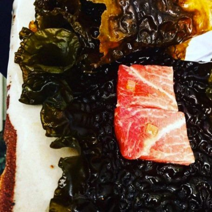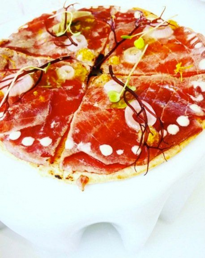 La piadina -que recuerda mucho a las tortillas mexicanas pero que es italiana y de trigo- de maíz fermentado, atún rojo y vinagreta de dashi es hojaldrosa, colorida y un compendio de sabores que nos lleva de paseo por el mundo.