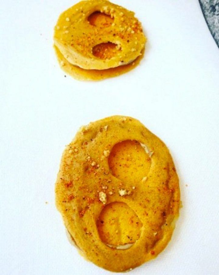 Se acaba esta parte con las piedras de parmesano, perfectas como trampantojo y en su mimetismo con las reales, tanto que en la caja que ven en la foto solo hay dos que no sean de verdad. Este plato ya se sirve hasta en las bodas de pueblo pero me siguen fascinando sus trampas y su intenso sabor a queso, su caparazón crujiente y su alma de queso líquido.