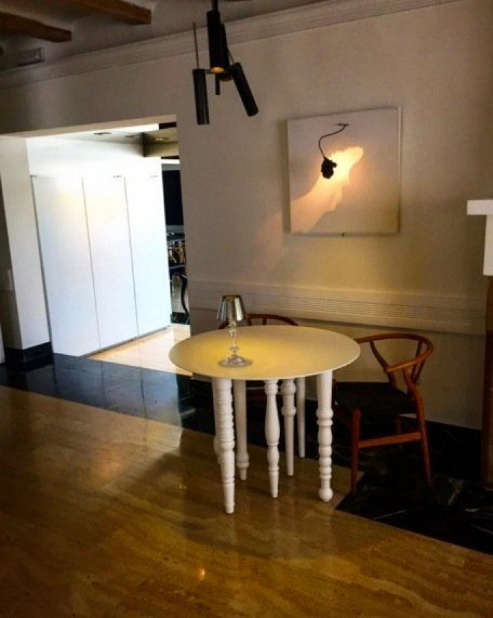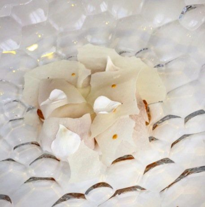 Aunque respeto el orden de la descripción tal como consta en el menú, el próximo plato ya se separa de los anteriores y se sirve como los restantes en el comedor, también muy blanco, desnudo y sobrio. Tan solo las piezas del Lladró más moderno alternan con mesas sin mantel y cuadros francamente feos. No así las figurillas de Jaime Hayón y de otros artistas que han revolucionado la empalagosa firma de porcelanas.