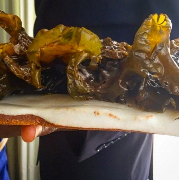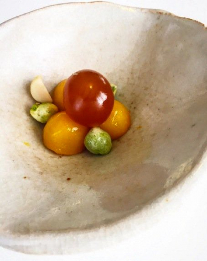 Se entiende que se diga que aquí comienza el 2° Acto porque tras la calma y los dulzores del azahar, las flores y los almendras que pueblan la Valencia más delicada, llega la furia del mar. Quizá más que acto debería llamarse segundo movimiento porque parece la irrupción en una sinfonía romántica de las furias y tempestades de un allegro molto brioso. Son las salazones que tanto veneran en esta tierra y que se tratan aquí con ortodoxia pero también con personalidad: pulpo seco a las llamas, huevas de mújol acariciada de curación y sal, "torta" de hueva de maruca en sal al aire, tonyna de sorra reposada entre kombu de azúcar y mechoui. Para descansar el paladar, cebolletas frescas encurtidas en vinagre de granada y papadam comino