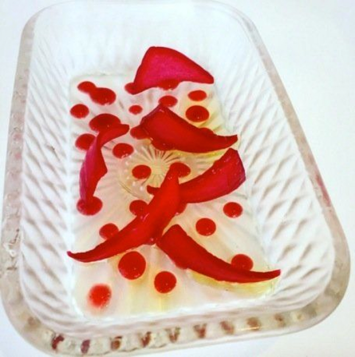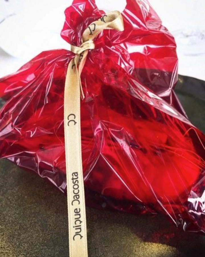 El homenaje sigue con la celebérrima gamba roja de Denia hervida en agua de mar con té de bledas. Es justamente famosa en todo el mundo por la consistencia de sus carnes y la fortaleza de su sabor. Si como decía Juan Ramón a la rosa no hay que tocarla, a esta gamba le pasa lo mismo. Con esa leve cocción en agua de mar hay más que suficiente. Las bledas (acelgas) aportan un contraste vegetal curioso, pero que poco aporta a tanta y tan natural exquisitez.