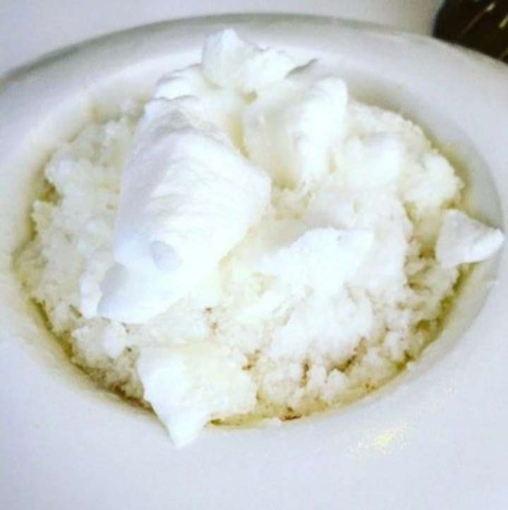 En ese ambiente tan blanco, empezamos con el más blanco de los platos, el turrón de almendro que, tras falsas flores de almendro que se deshacen al probarlas, esconde sabores sutiles que ennoblecen al más elegante de los ajoblancos.