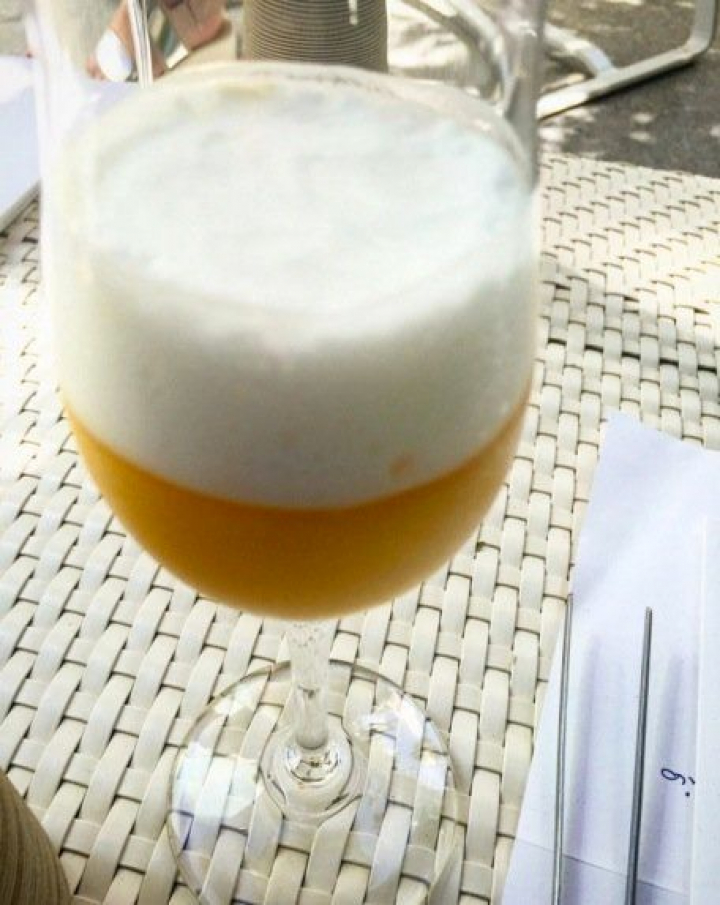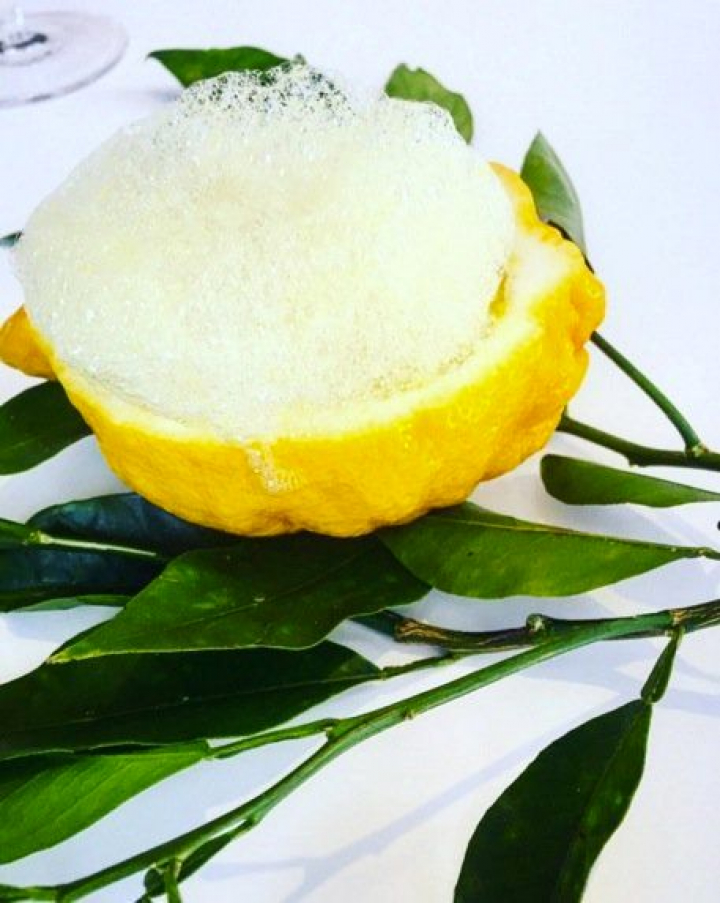 Se acaba este menú sin carnes con un prodigio de técnica y creatividad: huevo entre cenizas 2015 una perfecta creación que para ser posible requiere una cáscara falsa elaborada con espárragos blancos y unas cenizas hechas con arroz. Tan solo la yema auténtica se conserva escaldada en caldo de pichón. Asombroso.