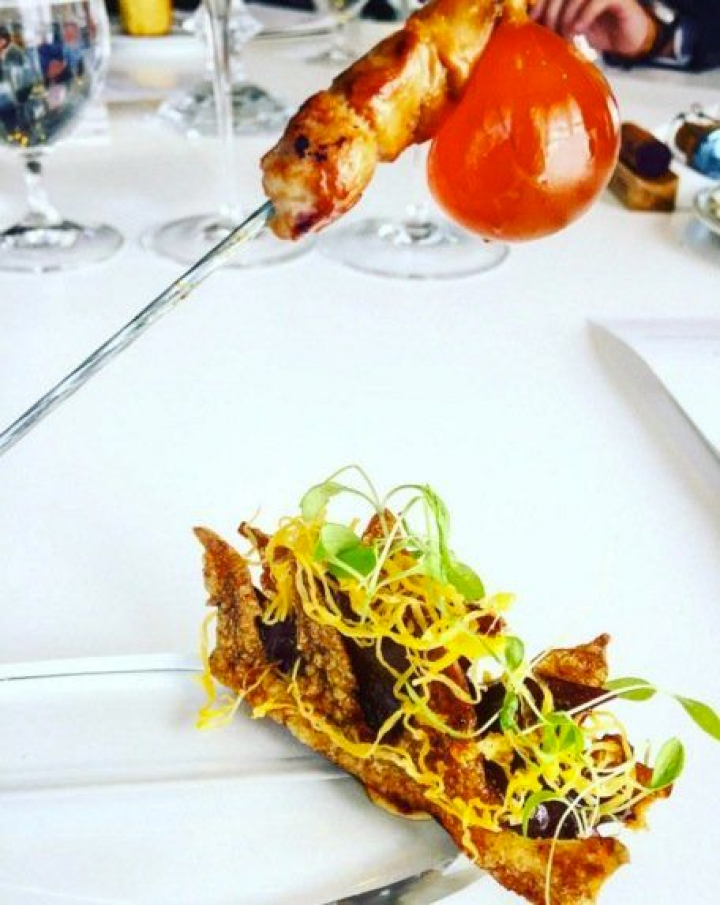 Estuvimos a punto de pedir el otro menú, Fronteras, porque una comensal, más valenciana que el arroz al horno, se moría por probar el cocido de gallina vieja, con sus huevos, cresta crujiente y carne al grill, así que amablemente nos lo añadieron. Tiene dos partes, la primera con un huevo solo yema, muy usado aquí, un delicioso caldo y diminutas verduritas (garbanzos tiernos, nabos, patata). La segunda consiste en una brocheta de pularda en teriyaki, otra yema y un crujiente bocadillo de cresta de gallo en pepitoria.