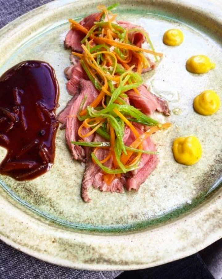 El roast pork de presa de ibérico con tirabeques, zanahoria, salsa Cumberland, mostaza Savora y ralladura de limón es una forma ingeniosa de españolizar el roast beef. El punto de la carne es perfecto y las dos salsas tan ortodoxas como adecuadas.