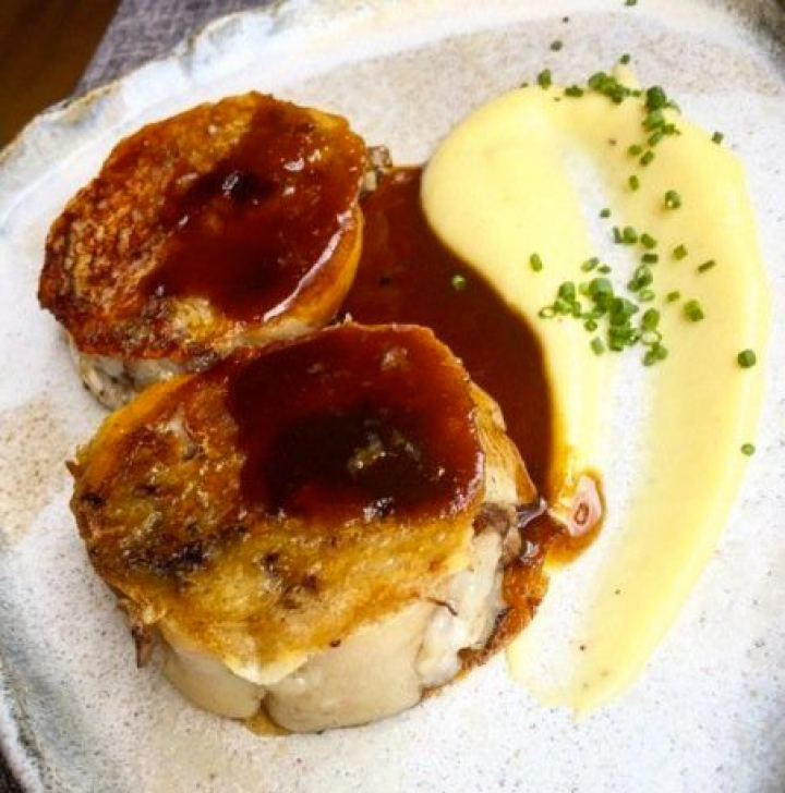 Lo que no hace falta españolizar, porque son más españolas que las castañuelas o el Hola, son las manitas rellenas de rabo de toro estofado y parmentier de patata. A mí esto de las manitas siempre me ha dado bastante repelús pero usar su gelatinosidad para envolver un delicioso guiso de rabo de toro resulta una idea excelente y el toque de la piel crujiente rematando cada medallón, una delicia que hay que probar. Tanto que hace olvidar la guarnición, demasiado facilona, del puré de patata aunque, pensándolo bien, ni siquiera hace falta comérselo y el contraste de dorados, ocres y amarillos resulta muy vistoso.